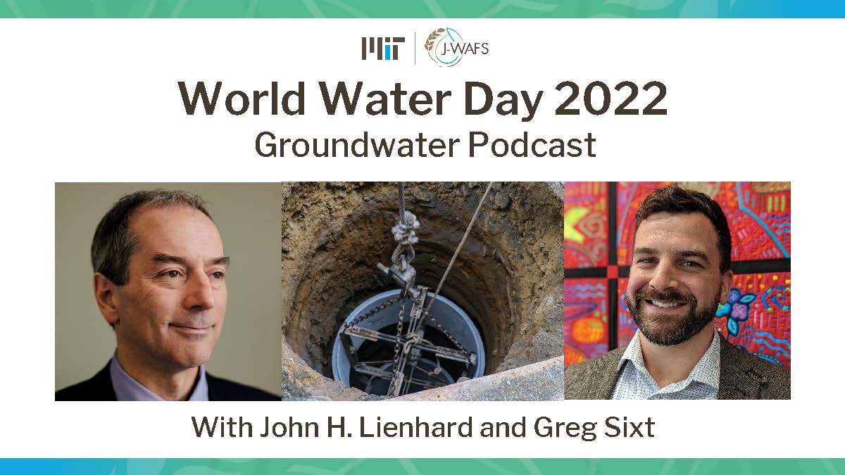 Banner with headshots for John Lienhard and Greg Sixt with a picture of a ground well in between. Text reads World Water Day 2022 Groundwater Podcast with the J-WAFS logo at the top