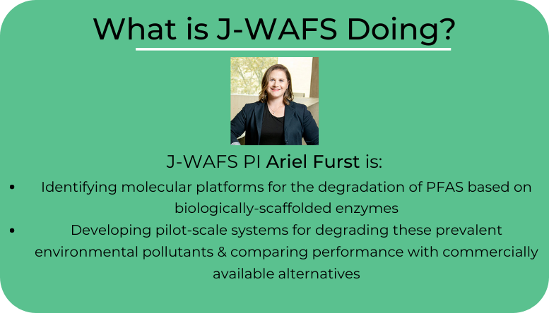 J-WAFS is also funding research to address PFAS. Ariel Furst of MIT's Department of Chemical Engineering, is developing methods for degrading these prevalent environmental pollutants. The proposed technology utilizes low-energy, scaffolded enzyme materials to degrade PFAS.