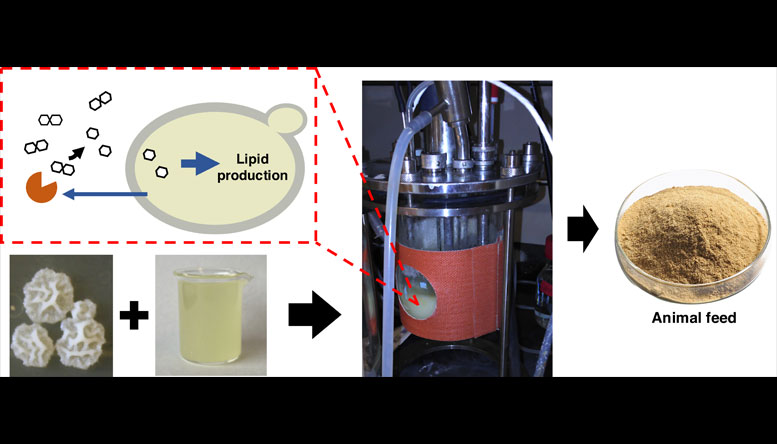 Turning acid whey, a byproduct from Greek yogurt production, into nutritious animal feed using engineered yeast cells in a bioreactor. Image credit: Constantinos Katsimpouras, Stephanopoulos research team