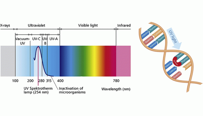 (a) UV range most lethal to microbes and (b) effect of UV radiation on microbial DNA structure (Picture Credits : Lisa F. Timmermann et. al. Evaluation of a mobile lightweight system, Travel Medicine and Infectious Disease)