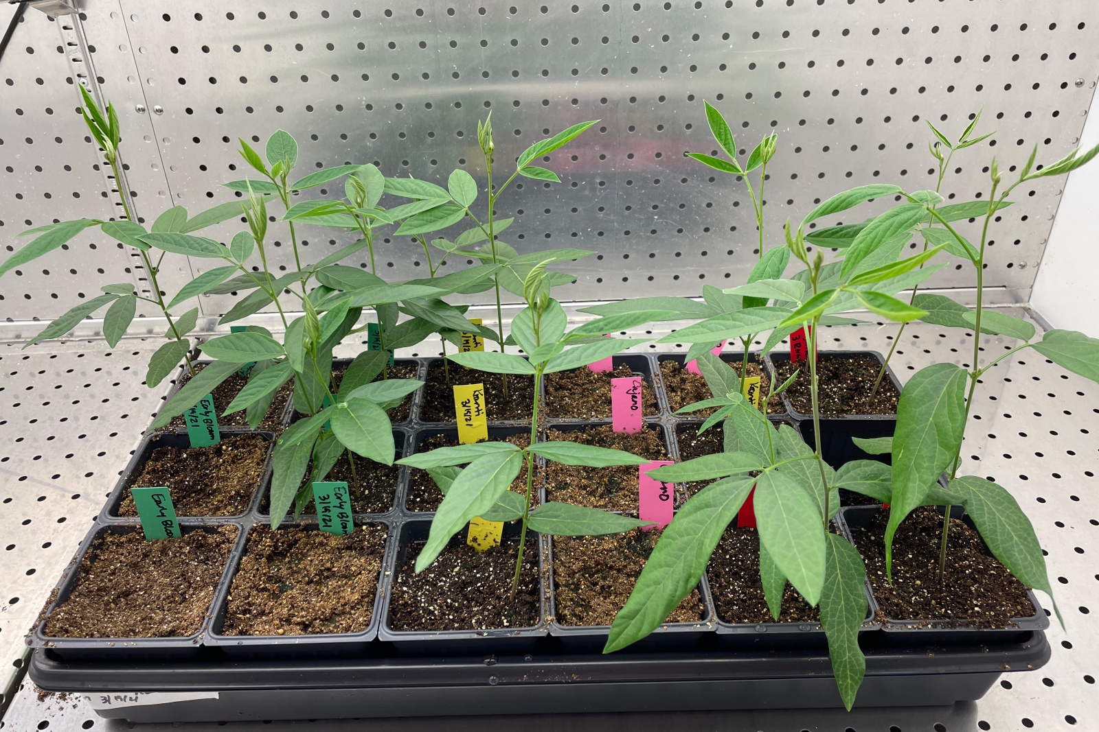 Pigeon pea (Cajanus cajan) seedlings growing in a growth chamber. Image Credit: Mary Gehring