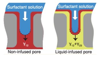 Schematic illustration of the interfaces in non-infused and liquid-infused pores. Graphic credit: Bazyar et al., Langmuir 2019, 35, 9513.
